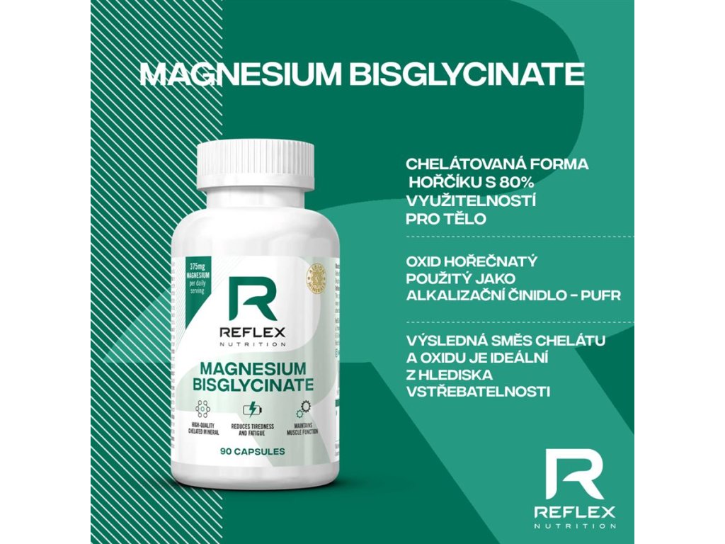 - Bisglycinát hořečnatý = chelátovaná forma hořčíku s 80% využitelností pro tělo bez nežádoucích vedlejších účinků. Produkt obsahuje i oxid hořečnatý použitý jako alkalizační činidlo, které zajišťuje ideální pH pro nejvyšší možnou biologickou dostupnost organického hořčíku = výsledná směs chelátu a oxidu je ideální z hlediska vstřebatelnosti.