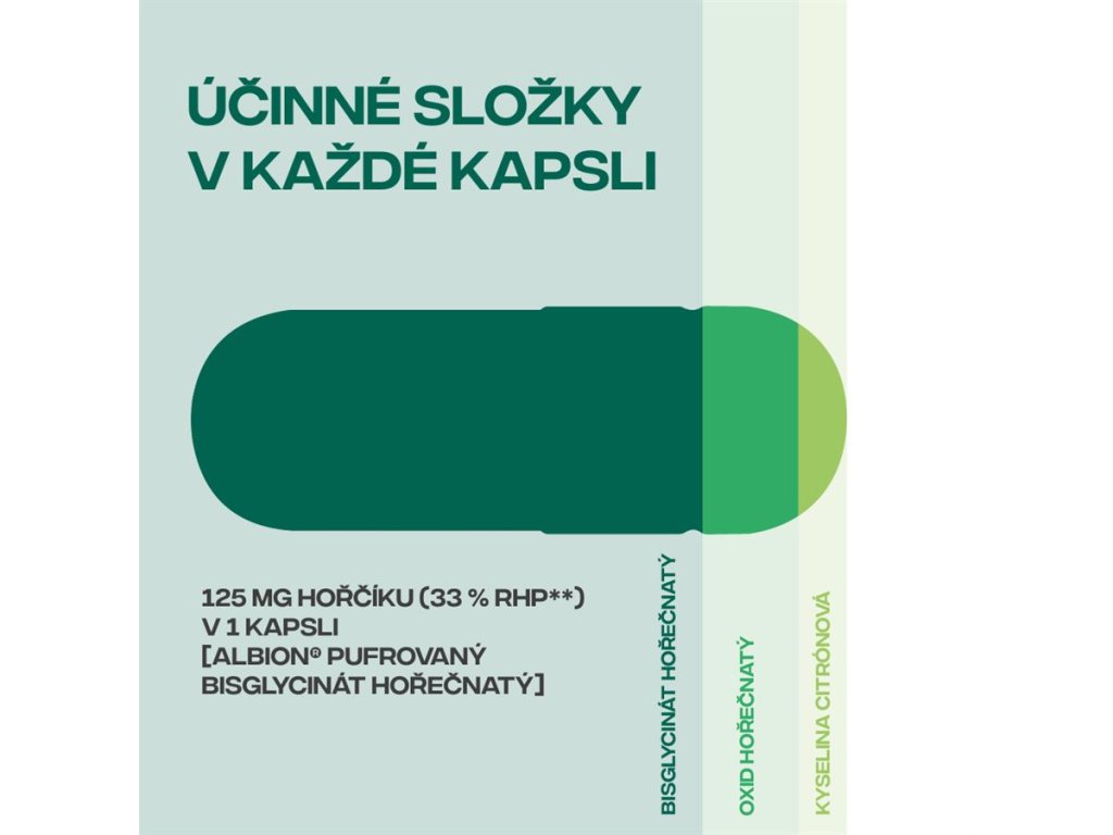 Složení v 1 želatinové* kapsli: 125 mg hořčíku (33 % RHP**) [Albion® pufrovaný bisglycinát hořečnatý (bisglycinát hořečnatý, oxid hořečnatý, kyselina citronová)], želatinová kapsle (hovězí želatina*, barvivo oxidy a hydroxidy železa), plnidlo maltodextrin, protispékavé látky (stearan hořečnatý, dioxid křemičitý). *nevhodné pro vegetariány. **% RHP - % referenční hodnoty příjmu.