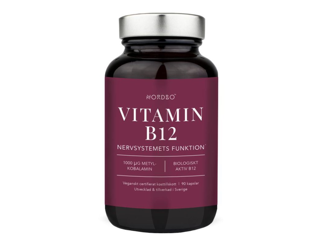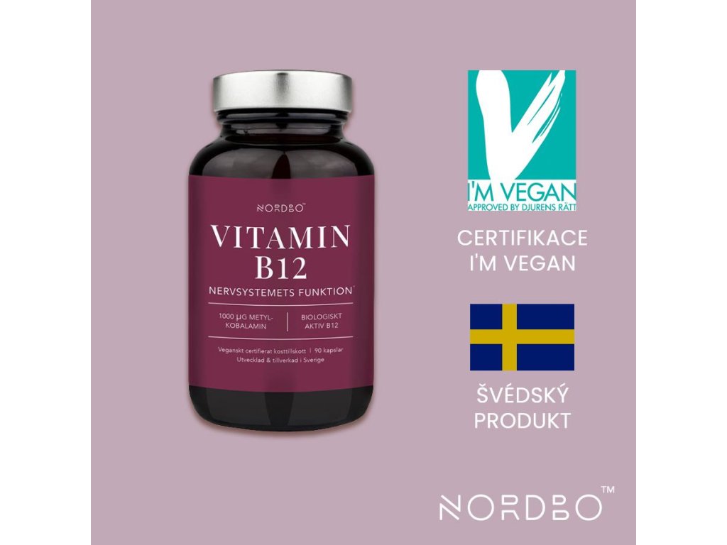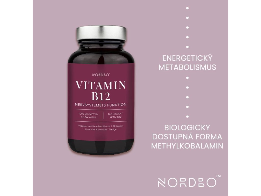 Nordbo B12 obsahuje vitamín B12 rostlinného původu v biologicky aktivní formě methylkobalaminu. Jde o formu vitamínu B12, kterou na rozdíl od běžných forem už organismus nemusí dále nijak přeměňovat, proto je velmi rychlá a má vyšší vstřebatelnost. Doplněk obsahuje velmi vysokou dávku vitamínu - 1000 µg = 40000 % RHP v 1 kapsli. Vlastnosti vitamínu B12 souvisí s energetickým metabolismem, užívá se při vysoké fyzické nebo psychické zátěži.