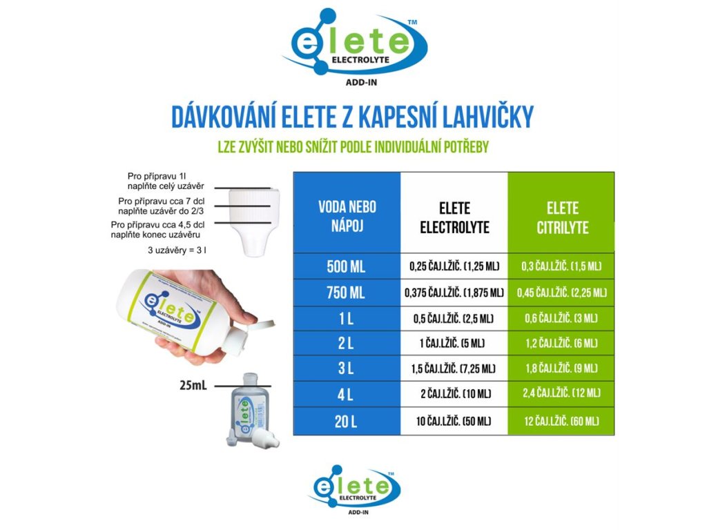 Jako základ doporučujeme dávkovat 2,5 ml elete™ na 1 litr vody. V případě zvýšené potřeby elektrolytů (časté svalové křeče, extrémní horko, extrémní intenzita sportovního výkonu) lze doporučenou dávku zdvojnásobit = 5 ml elete™ na 1 litr vody.
