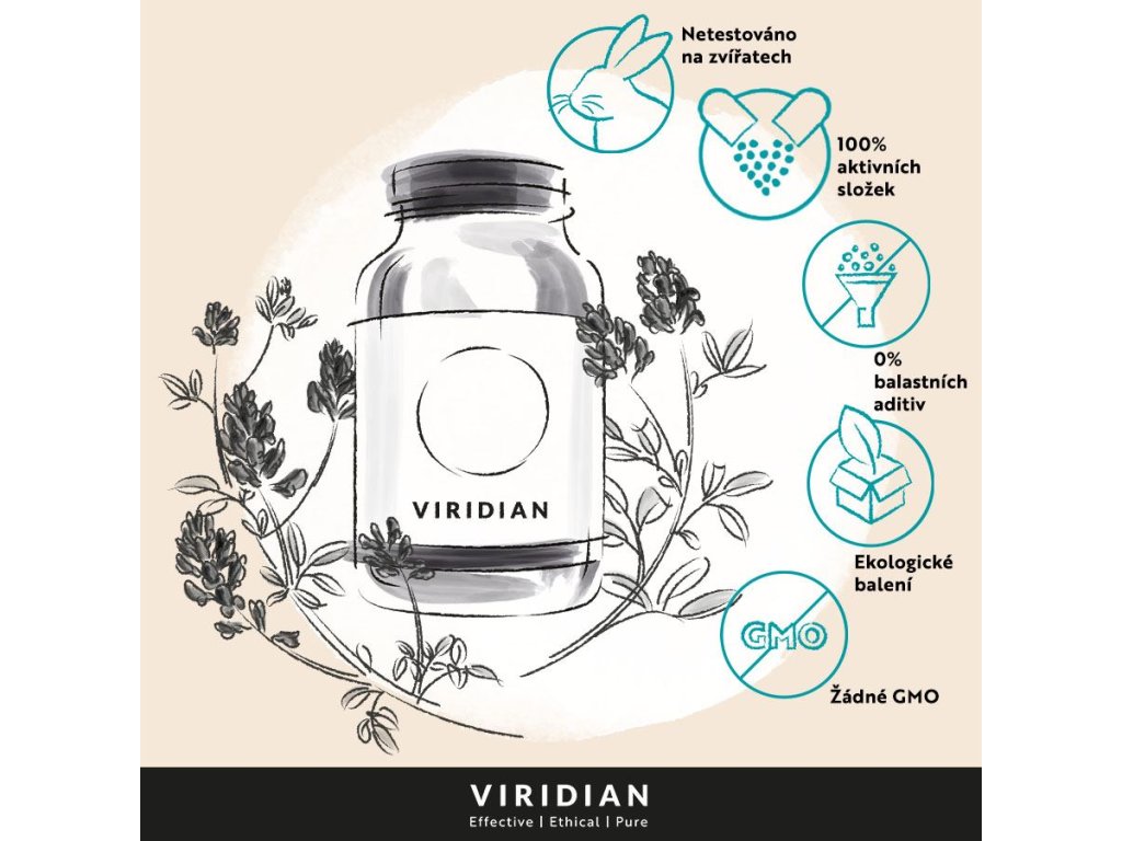 | Produkty Viridian Nutrition obsahují 100 % čistou směs aktivních složek, to vše bez obsahu balastních aditiv, pojiv a plnidel. Používáme pouze takové ingredience, které jsou nejen maximálně účinné a využitelné, ale také přirozené pro lidské tělo, životní prostředí a celou naši planetu. | Jednou z klíčových a nosných zásad Viridian Nutrition je podpora místních producentů, s nimiž má velmi korektní, dlouhodobé a férové vztahy. Viridian Nutrition tak garantuje kvalitu svých doplňků, protože má přehled o celém výrobním procesu - od semínka až po finální produkt. | Viridian Nutrition spolupracuje s dodavateli, kteří splňují přísná kritéria a používají etické přísady, které nejsou testovány na zvířatech. Používáme suroviny, které jsou založeny na recenzovaných vědeckých studiích a pochází z nejlepších dostupných bioklimatických podmínek pro optimální účinek. |