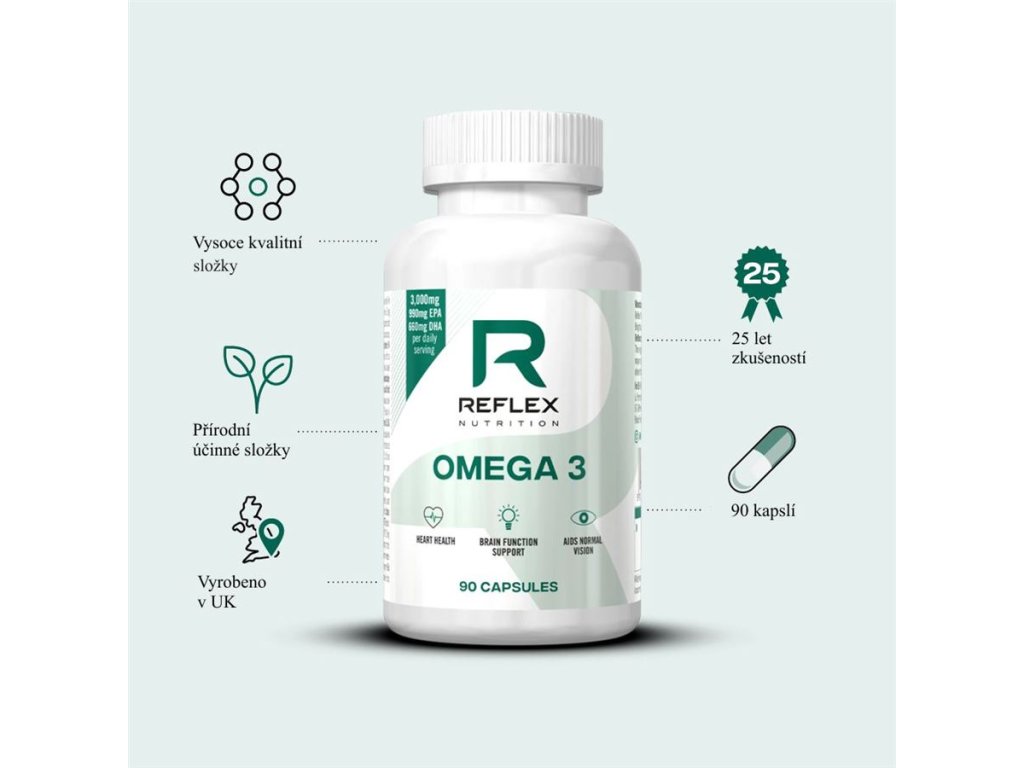 Omega 3 značky Reflex Nutrition jsou výjimečným zdrojem nenasycených mastných kyselin, s vysokým obsahem EPA a DHA, které nejsou snadno dostupné v přirozeném jídelníčku. Bez obsahu těžkých kovů a dalších znečišťujících složek.